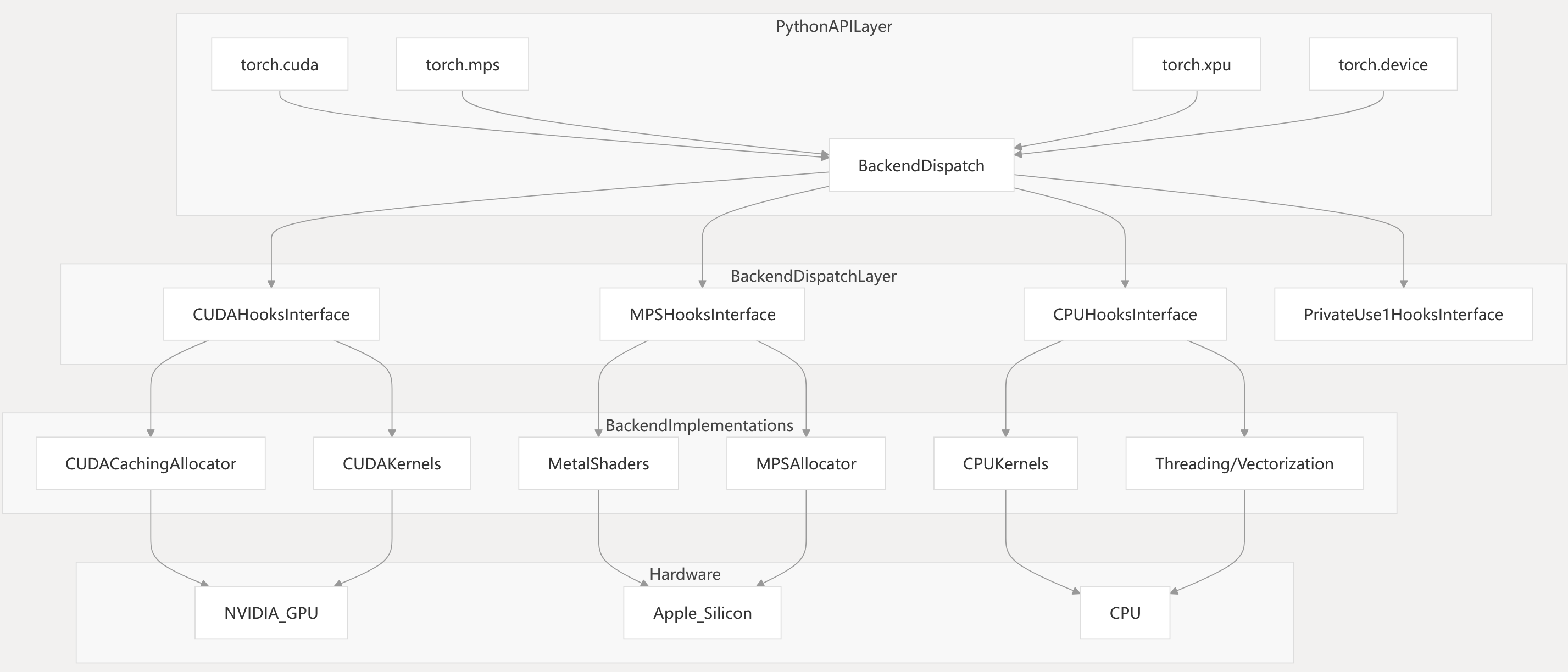 PyTorch’s device backend system is organized in layers, with high-level APIs dispatching to device-specific implementations via a unified dispatch and registration mechanism.