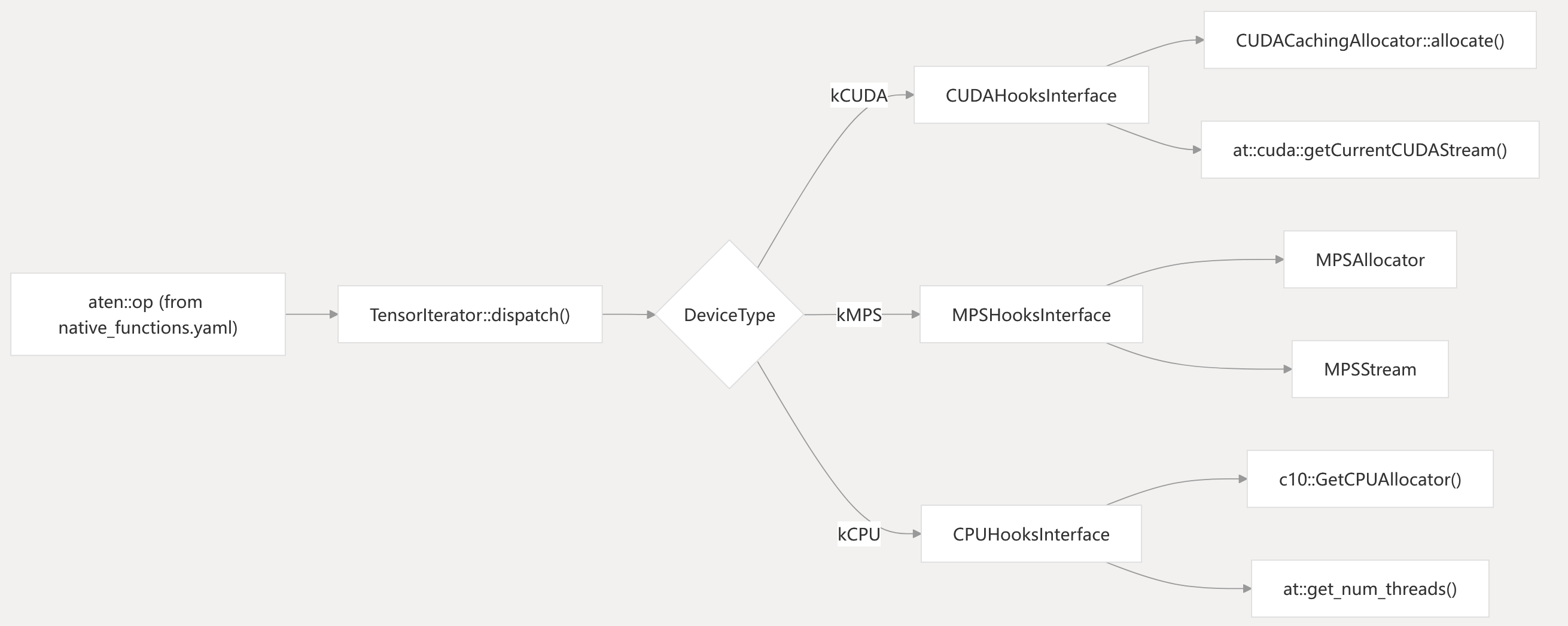 The dispatch system uses compile-time registration of backend hooks, and runtime selection based on the device type of the input tensors. The native_functions.yaml file specifies which operators are implemented for which backends, using dispatch keys such as “CPU”, “CUDA”, “MPS”, etc.