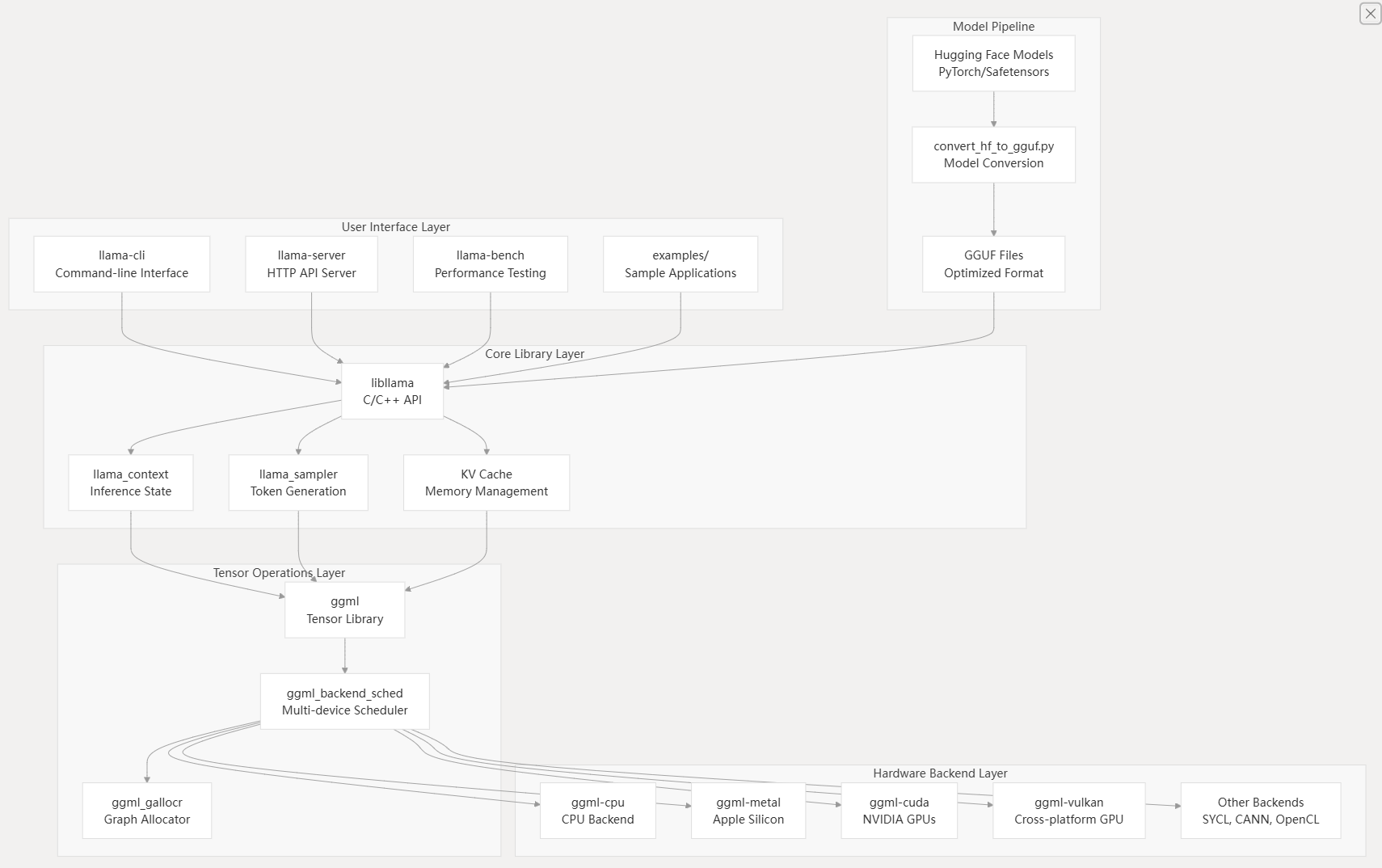 The llama.cpp system follows a layered architecture that separates concerns between user interfaces, inference logic, tensor operations, and hardware backends.