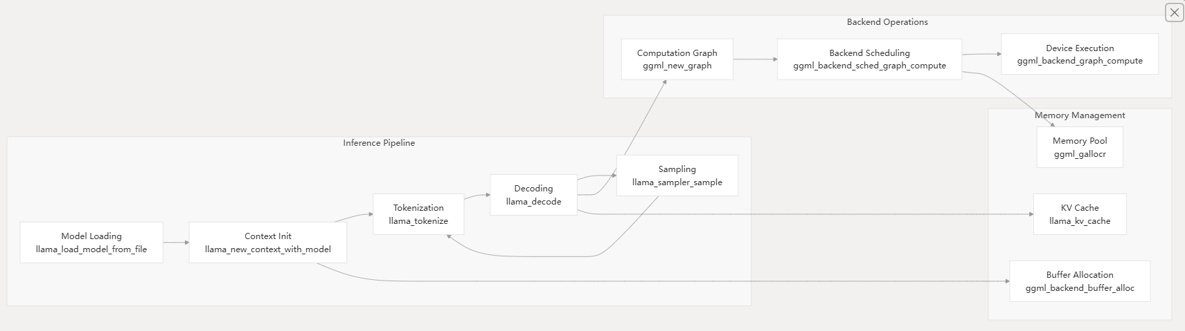 llama_model- Represents a loaded model with weights and architecturellama_context- Maintains inference state including KV cache and sampling parametersllama_batch- Batches multiple sequences for efficient parallel processingllama_sampler- Configurable token sampling strategies