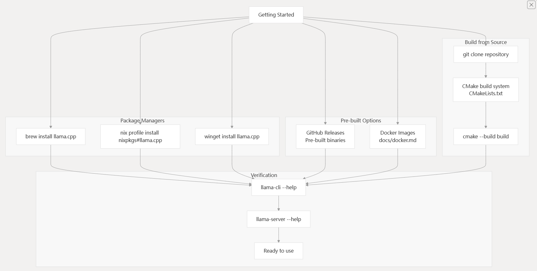 llama.cpp offers multiple installation methods to accommodate different user preferences and environments. The choice depends on your platform, development needs, and whether you want pre-built binaries or custom compilation.