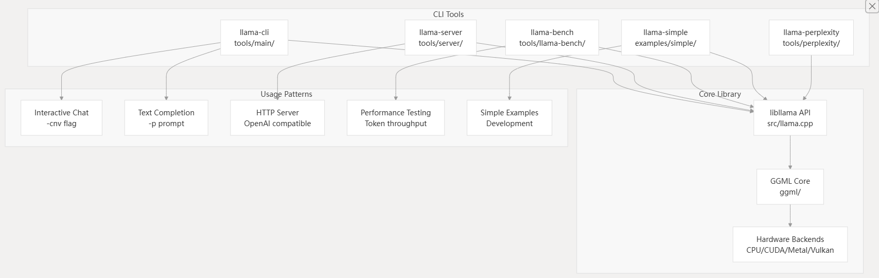 llama.cpp provides several command-line tools for different use cases. Understanding the relationship between these tools helps choose the right one for your needs.
